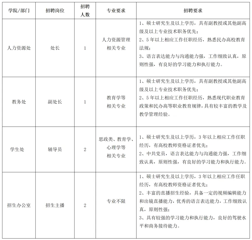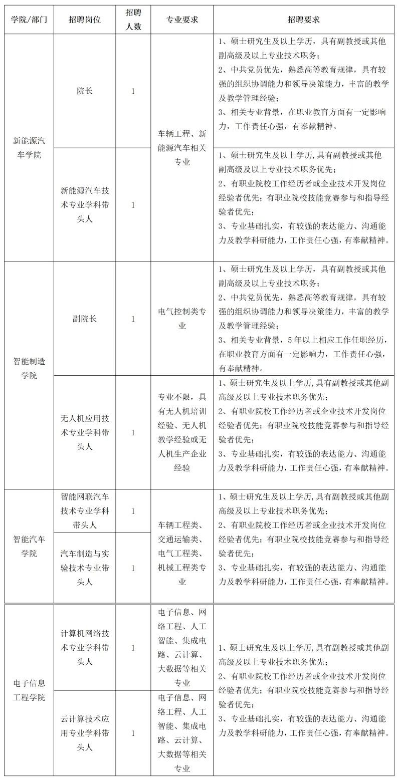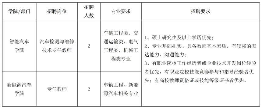 郑州汽车工程职业学院是经河南省人民政府批准、教育部备案的一所普通高等职业院校。学校位于河南省省会郑州市,毗邻郑州汽车产业园,交通发达,区域位置优越独特,校园文化气息浓厚,环境优雅,温馨宜人,是莘莘学子学习、生活的理想场所。学校立足郑州,面向河南,辐射全国。依托汽车制造产业,形成以汽车制造与汽车服务类专业为主体,以电子信息技术类、装备制造类、电商物流类、文化艺术类专业为支撑的框架结构;培养动手能力强、综合素质高、具有创新精神的技术技能型人才。 学校办学特色明显,专业优势突出,是河南省第一所建在产业园区的汽车类高等职业院校,把课堂搬到了工厂车间和生产一线,真正实现了“前厂后校”“校中厂、厂中校”的办学模式。所有专业都围绕汽车产业开设,现设有新能源汽车学院、智能汽车学院、智能制造学院、电子信息工程学院、电商物流学院、数字艺术与设计学院、通识教育学院、公共艺术教育中心、马克思主义学院等二级学院;开设有汽车类、计算机类、道路运输类、电子商务类、物流类、艺术设计类、广播电视类等二十余个专业,每个专业都高度契合河南省汽车及装备制造等产业发展需求。 现面向社会诚聘管理干部及专业教师,期待大家的加入!希望未来能与大家携手进步,共同发展,实现学校和个人“双赢”发展目标。 二、招聘对象基本条件 1、具有中华人民共和国国籍,拥护中国共产党的领导,以习近平新时代中国特色社会主义思想为指导,热爱教育事业; 2、遵守宪法和法律;具有良好的品行,具有较强的敬业精神和团队协作精神,乐于奉献; 3、身心健康,具有正常履行职责的身体条件; 4、具有岗位所需要的专业和技能条件,具有科研创新能力,统招硕士研究生及以上学历(特别优秀的可以放宽到统招本科、非统招硕士研究生);相应岗位需具有高校教师资格证书(具体要求以《招聘岗位及具体要求》为准); 5、教师岗位原则上年龄在40周岁以下;副高以上职称人员原则上年龄不超过55岁(特别优秀的可适度放宽); 6、同等条件下,具有高校教师资格证书者优先;专业岗位具有对应岗位工作经验者优先;管理干部岗位具有副高以上职称及对应岗位工作经验者优先。 三、聘用及福利待遇 1、按国家相关规定签订正式劳动合同,入职缴纳五险一金; 2、高层次人才福利待遇一人一议,其他行政岗及教师岗待遇从优,执行学校薪酬标准; 3、享受国家法定的节假日及带薪寒暑假,并享有节日福利、兼职津贴、年度绩效考核奖; 4、符合条件者,提供宿舍,配备空调、热水器等基本生活设施; 5、教职工餐厅提供用餐,学校给予餐补; 6、提供教师进修培训机会; 7、引进的人才在享受学校相关待遇的同时若符合“智汇郑州”人才工程的补助条件,则可享受每月1000-1500元的生活补贴及5-10万元的购房补贴。 四、招聘岗位及具体要求 高层次人才岗 行政管理岗 二级学院教师岗 五、简历投递