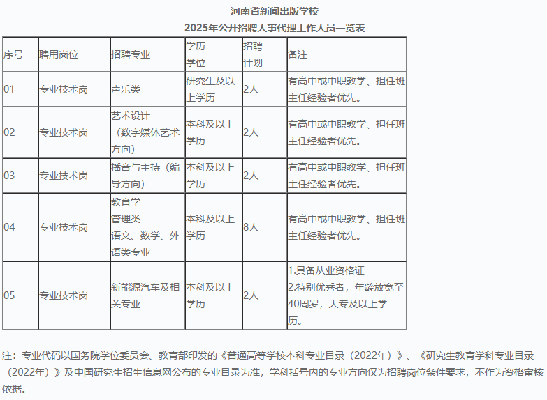 本次面向社会公开招聘工作人员16名,岗位设置、招聘专业、招聘人数详见《河南省新闻出版学校2025年公开招聘人事代理工作人员一览表》(附件),应聘人员报名专业须与招聘专业相一致,招聘专业以国务院学位委员会、教育部印发的本科教育学科专业目录和研究生教育学科专业目录(2022年)为准。