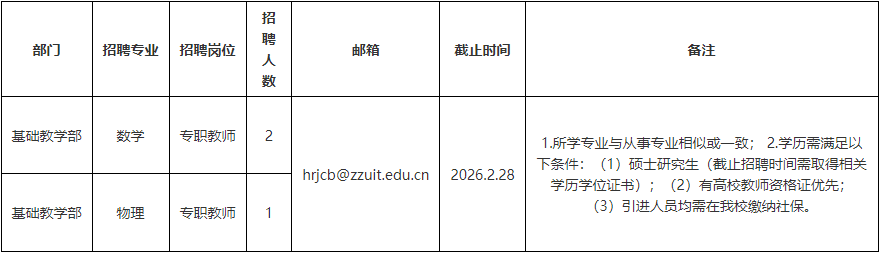 郑州工业应用技术学院基础教学部2026年专职教师招聘公告
