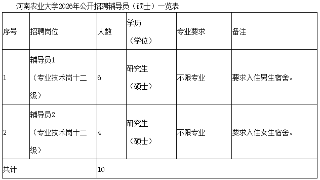 7.其他要求见附件2《河南农业大学2026年公开招聘辅导员(硕士)一览表》。
