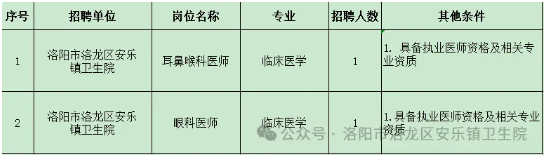 · 具备良好的职业道德和强烈的责任心,爱岗敬业、踏实肯干; · 愿意投身医疗事业,与单位共同成长 ,履行救死扶伤的职业责任; · 符合拟聘用岗位要求的资格条件(资格证、执业证等) 三、福利待遇 薪资待遇面议 四、报名须知 · 报名时间:即日起至2026年2月28日止。 · 报名地点:洛龙区安乐镇卫生院 403办公室 · 所需材料:请携带个人简历、身份证、学历学位证书、相关专业资质证书(执业证、资格证等)的原件及复印件。 · 联系人:朱先生 · 联系电话:0379-61292125