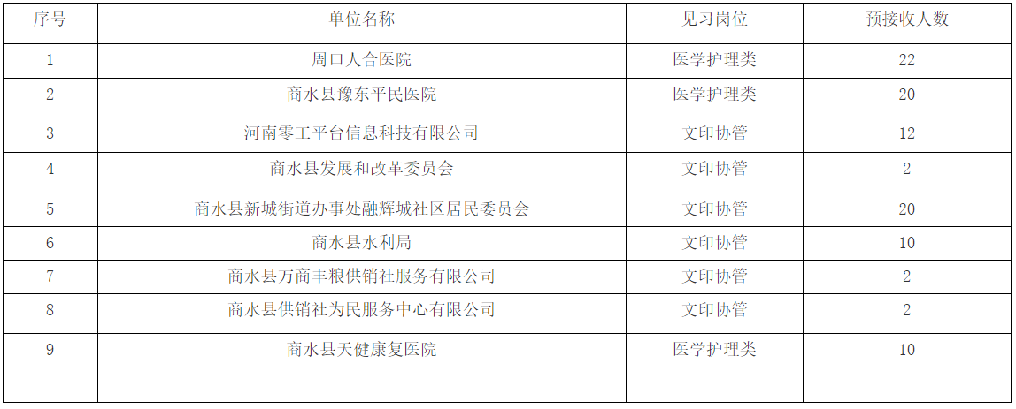 本次就业见习岗位由我县已认定的就业见习单位提供,涵盖机关事业单位、企业、社会组织等各类主体,具体岗位名称、见习人数、学历专业要求、见习地点、基本生活费标准等详细信息,可通过商水县人民政府官网或前往商水县公共就业人才服务机构现场咨询。